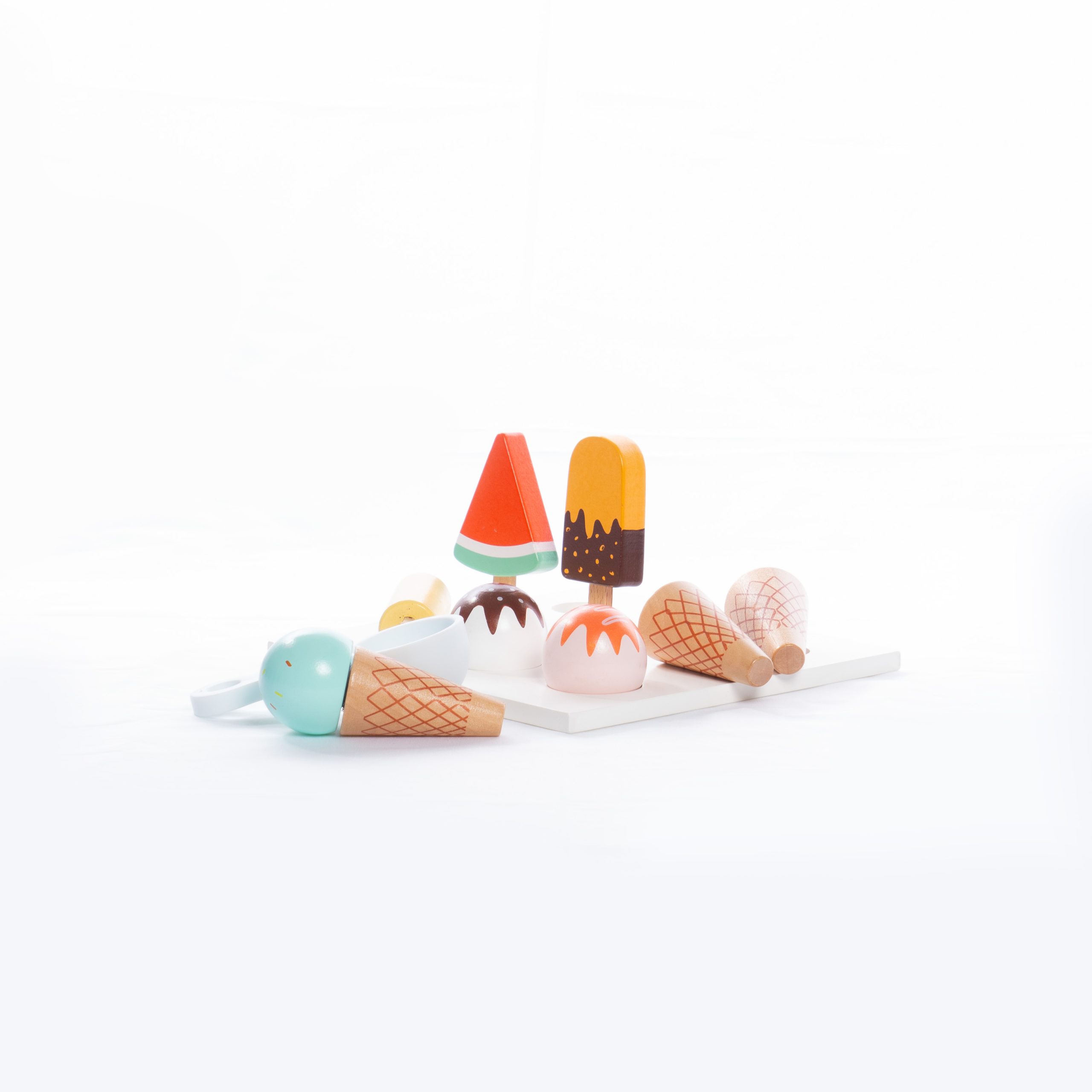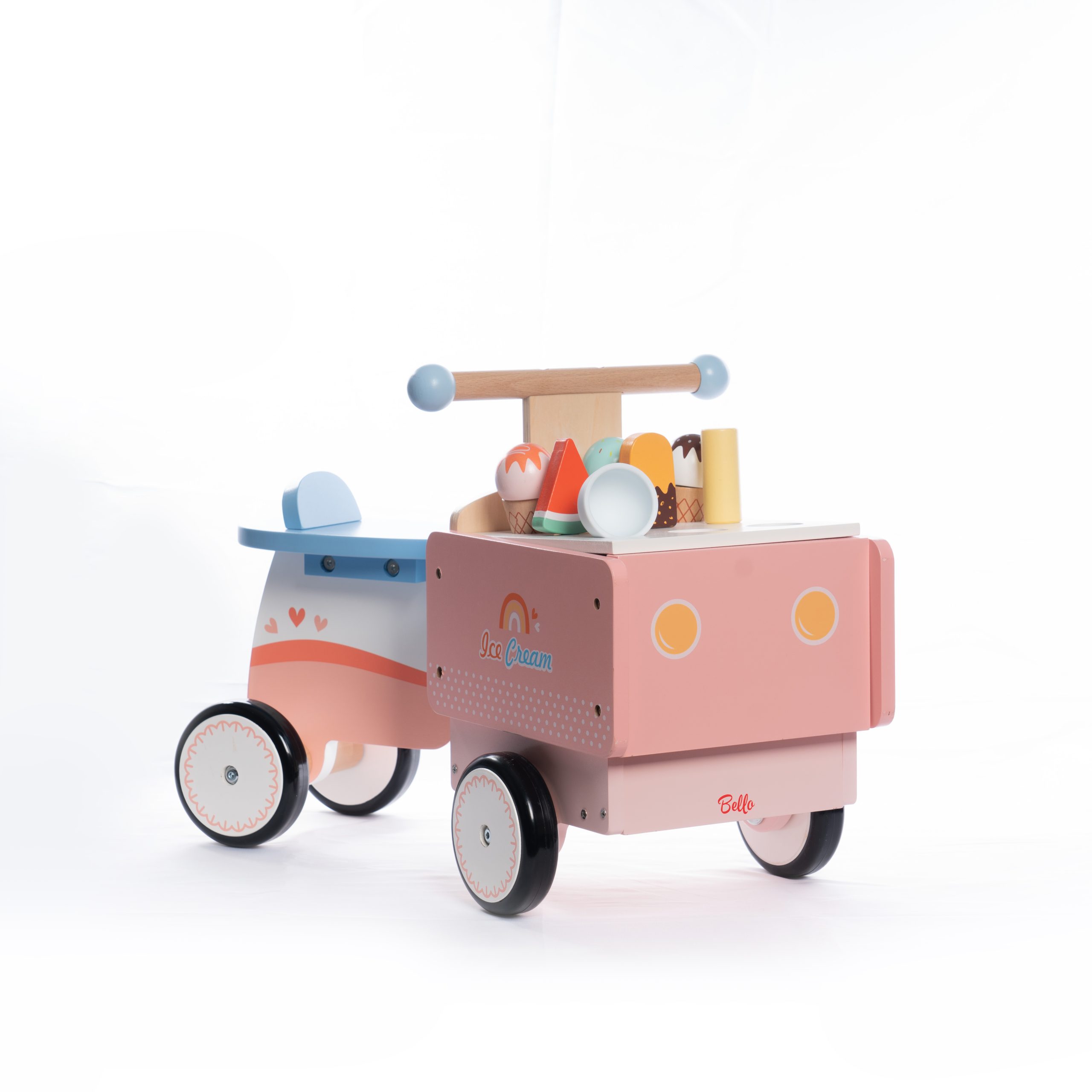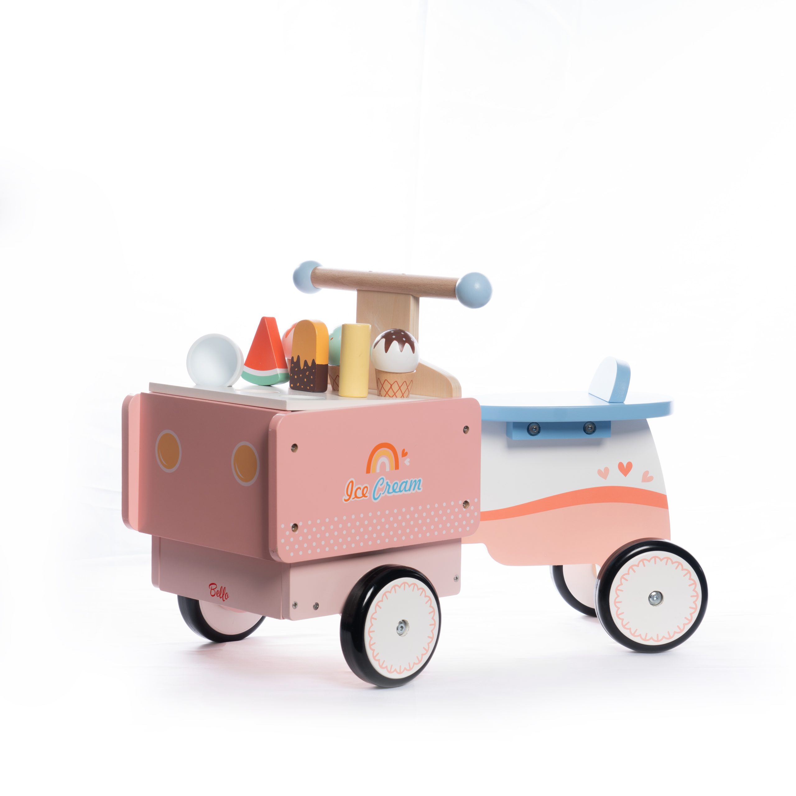 One scoop or two! Ride around on this adorable ice cream cart serving delicious treats to friends and family. The wooden cart comes it with 6 flavoured ice creams and an ice cream scoop.