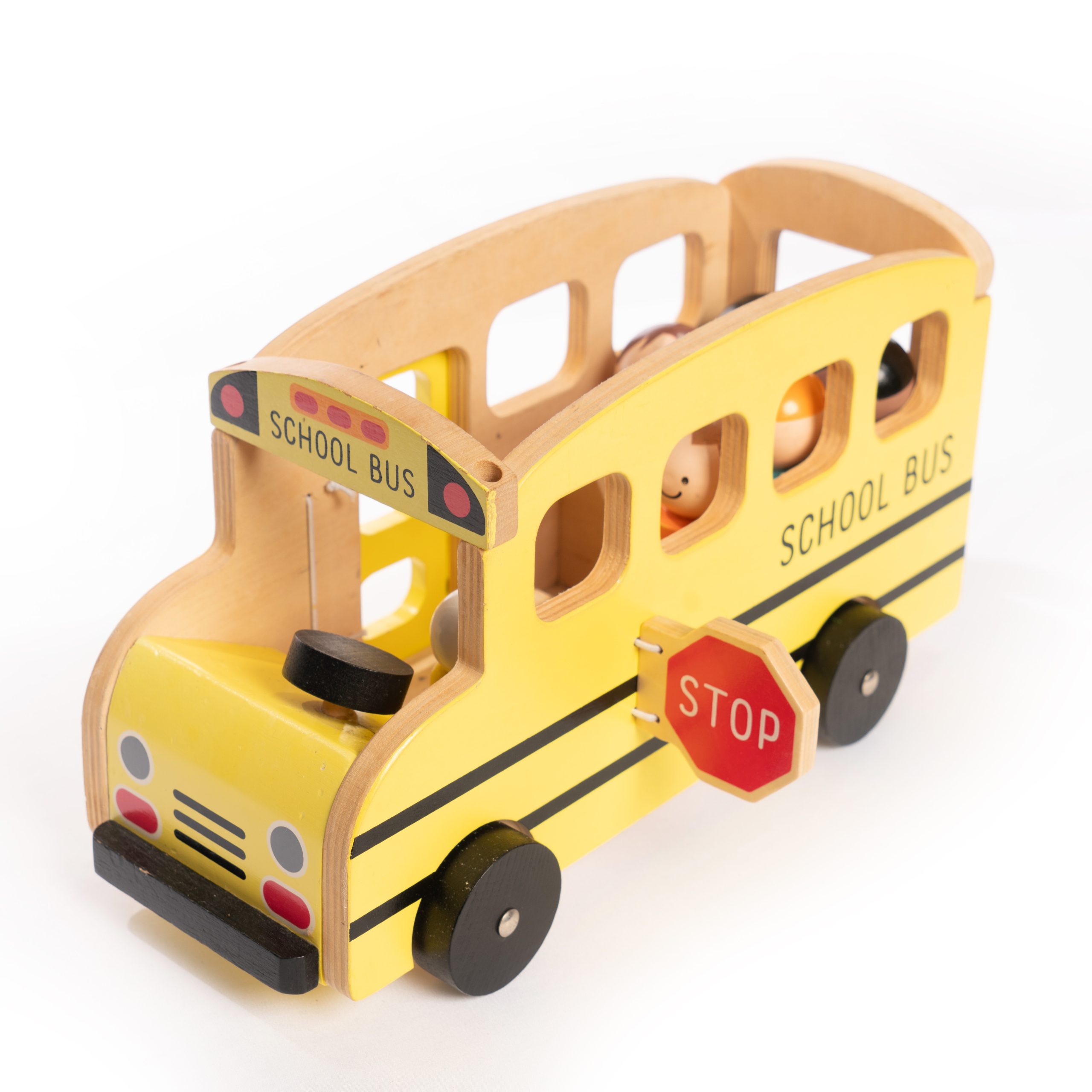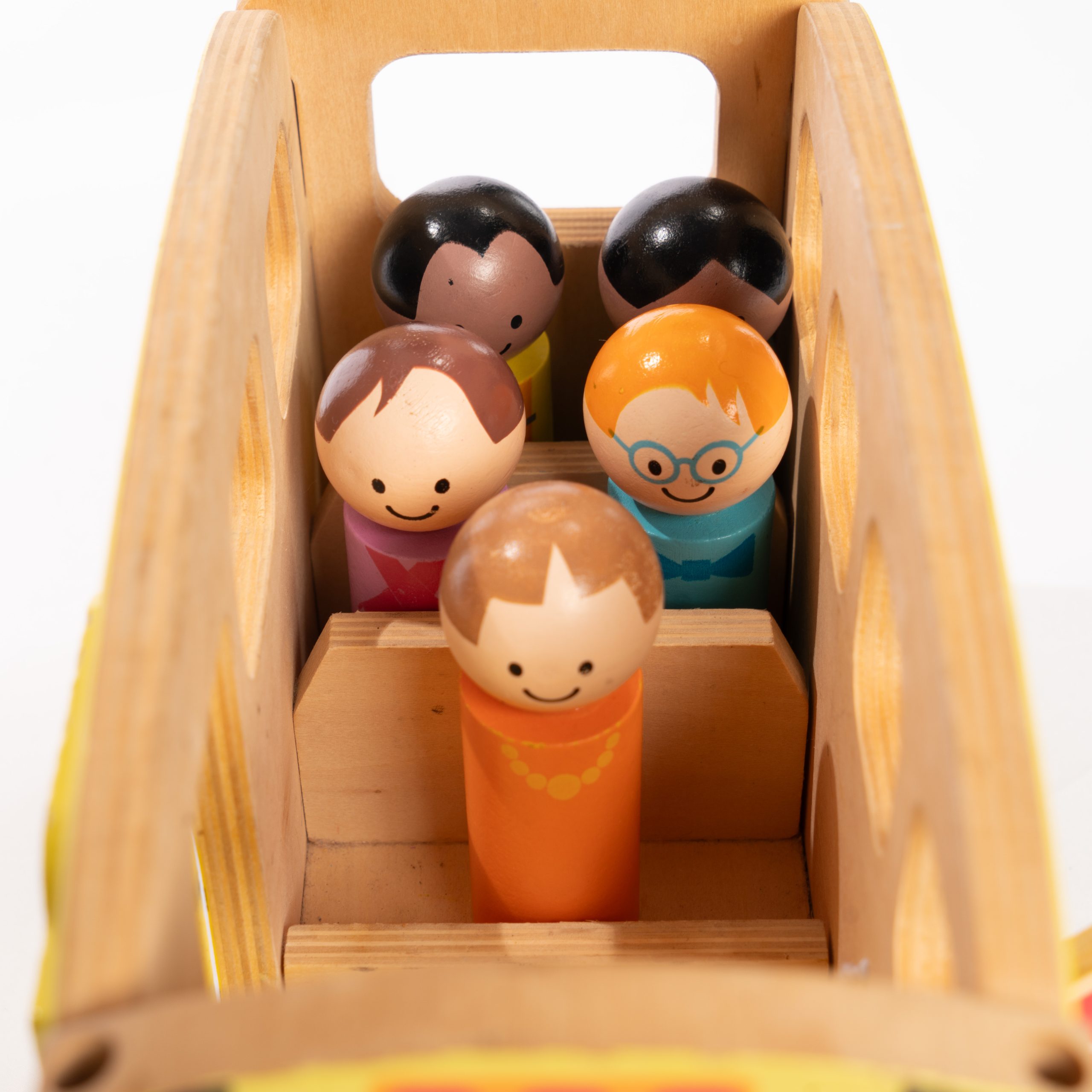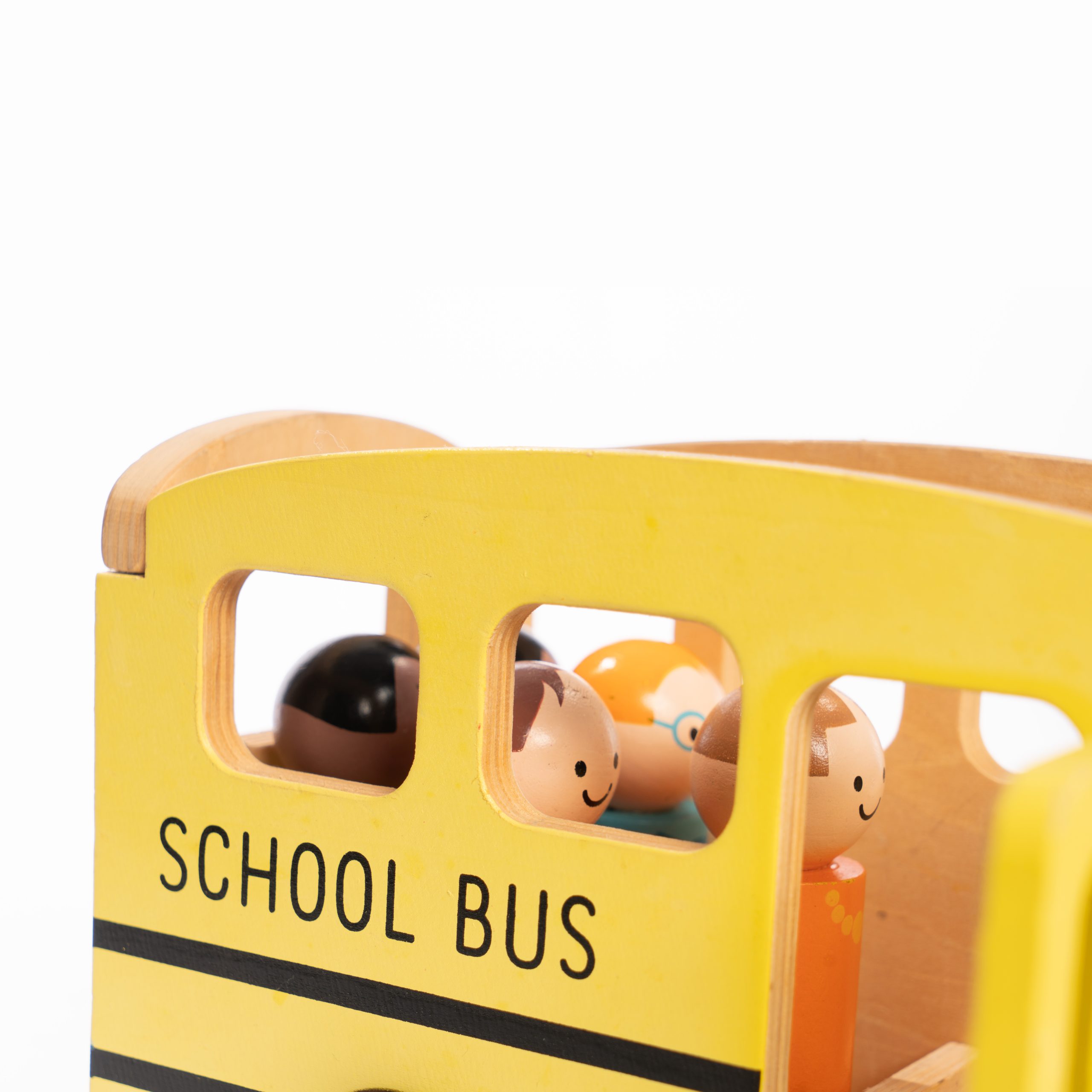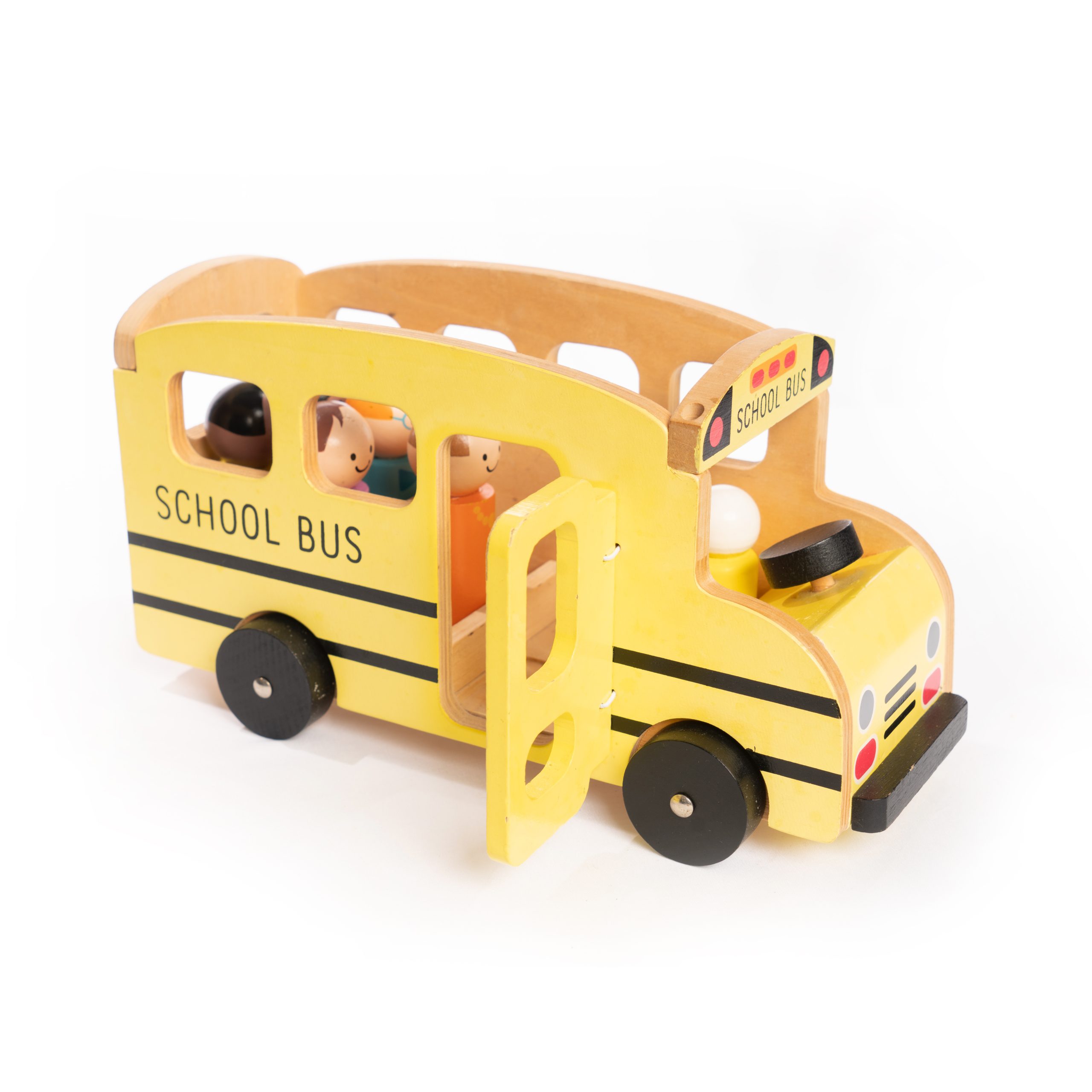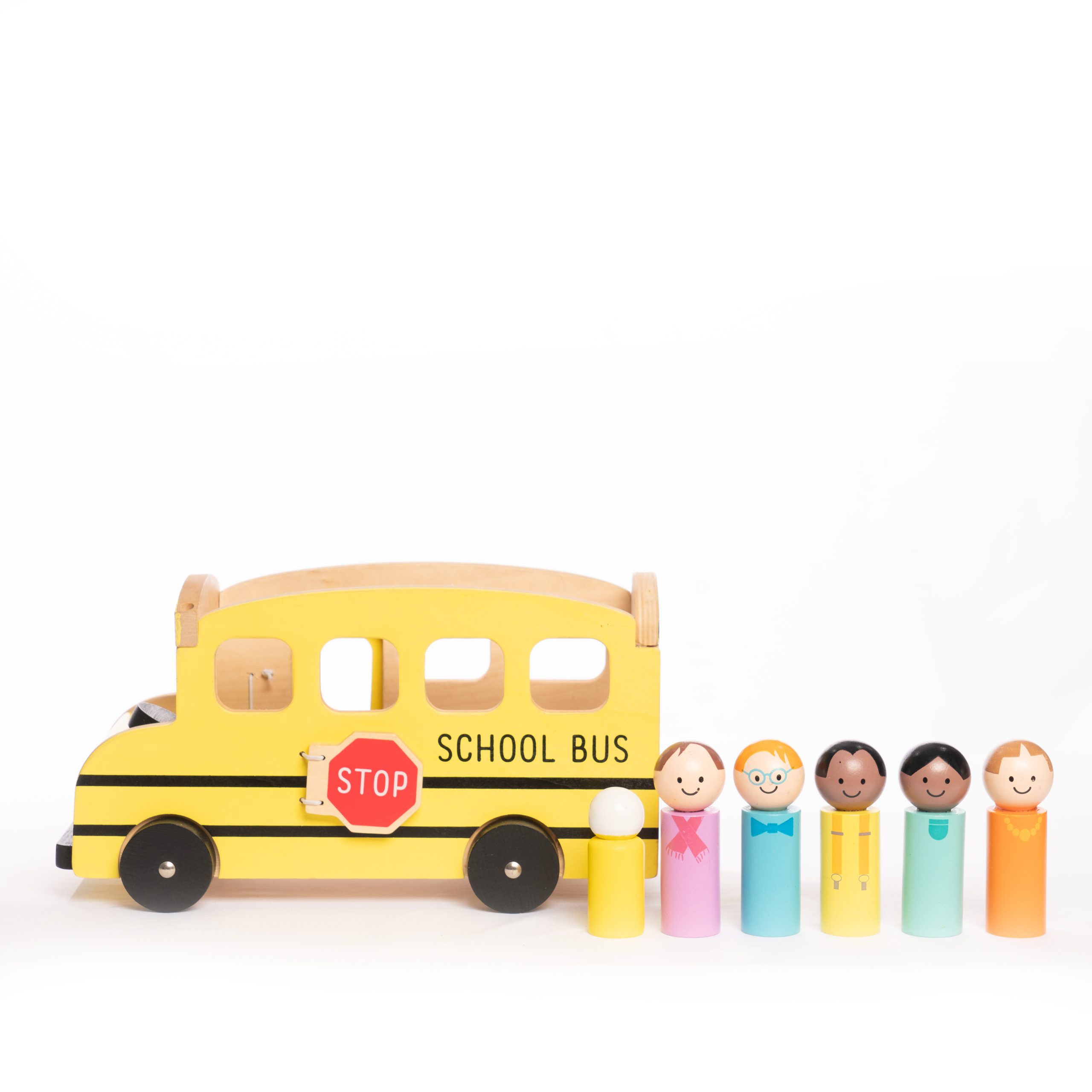Your little one can pretend to drive or be a passenger on this Wooden School Bus! Includes 6 people and 1 bus. Made with Soil wood, medium density fibreboard. This toy helps teach and develop imagination, free play and fine motor skills