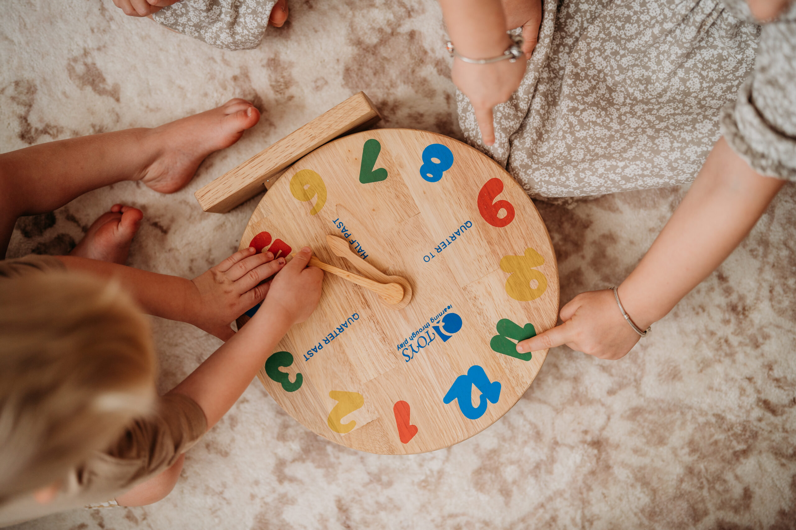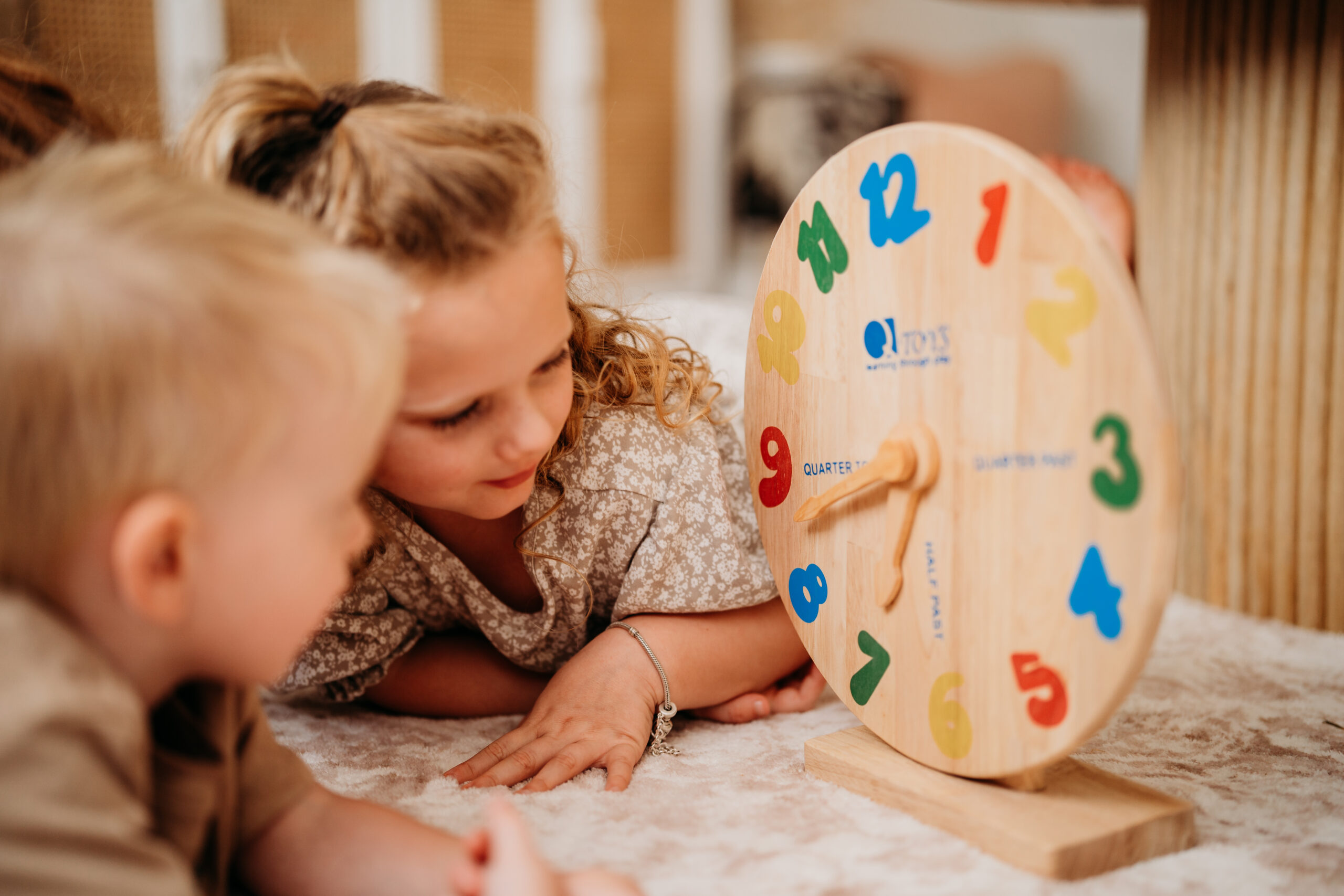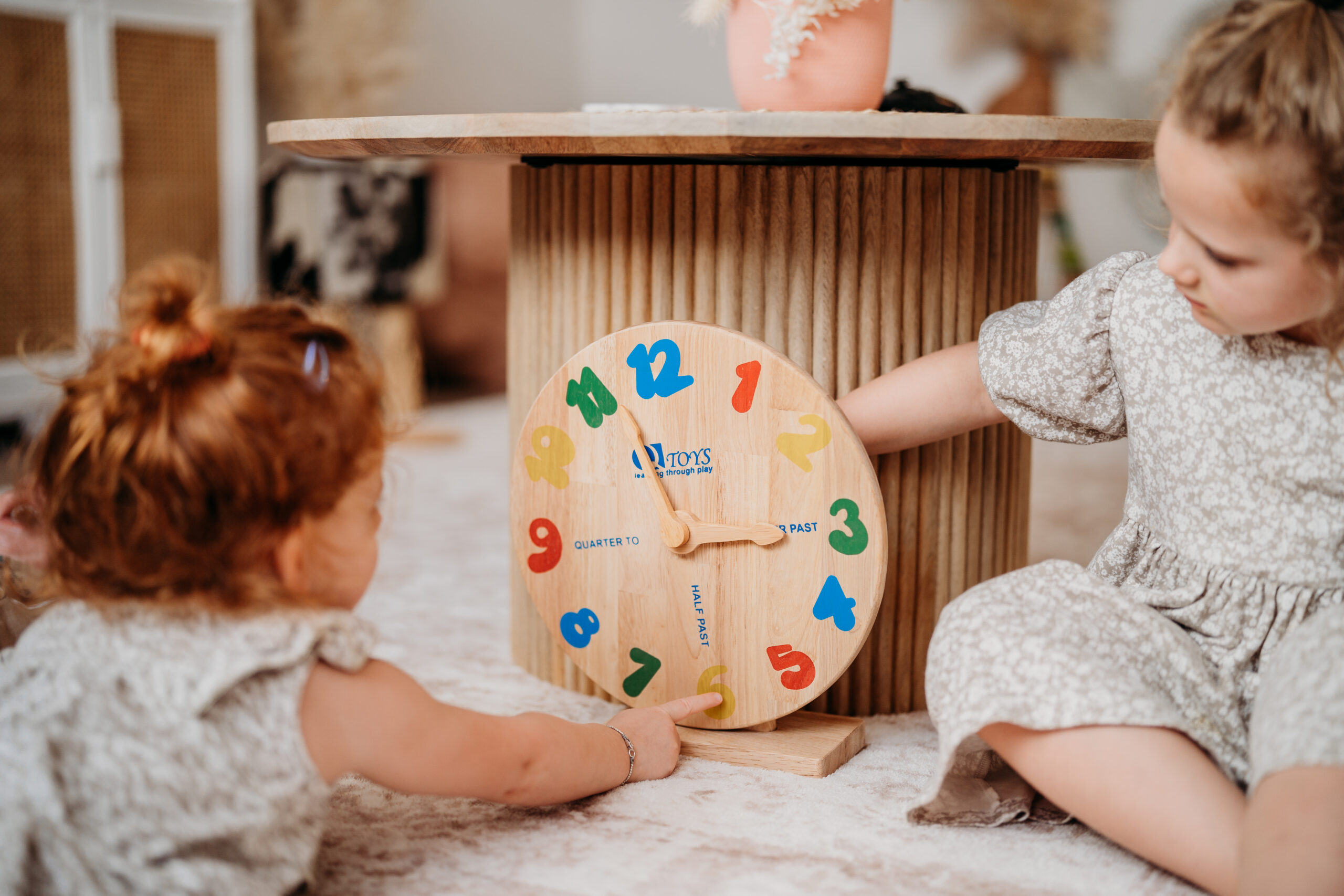 This child-friendly wooden clock helps kids learn to tell time through hands-on play. With bright, easy-to-read numbers and a working button at the back, children can explore hours, minutes, and seconds. Made from non-toxic, child-safe materials, it makes learning time fun and interactive.