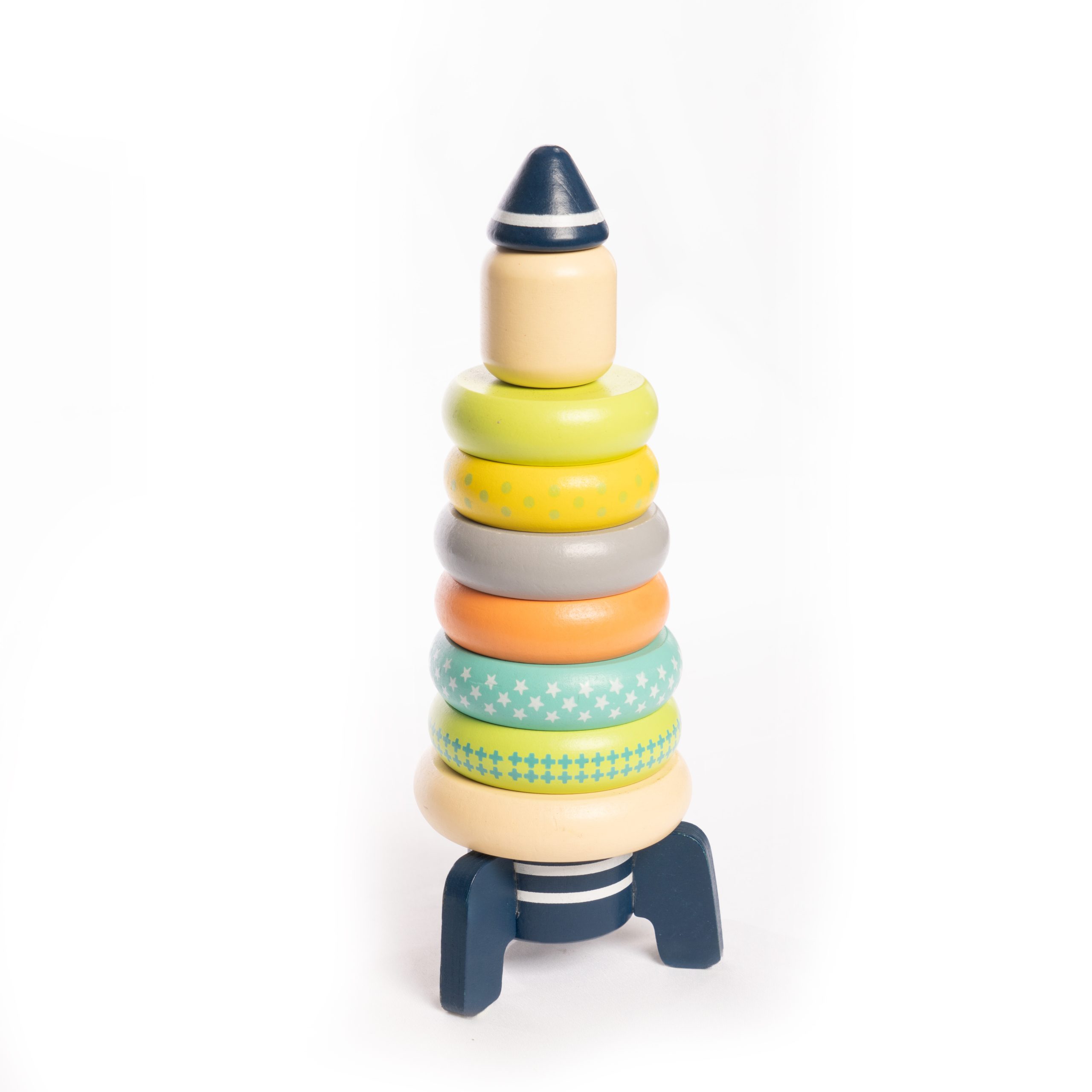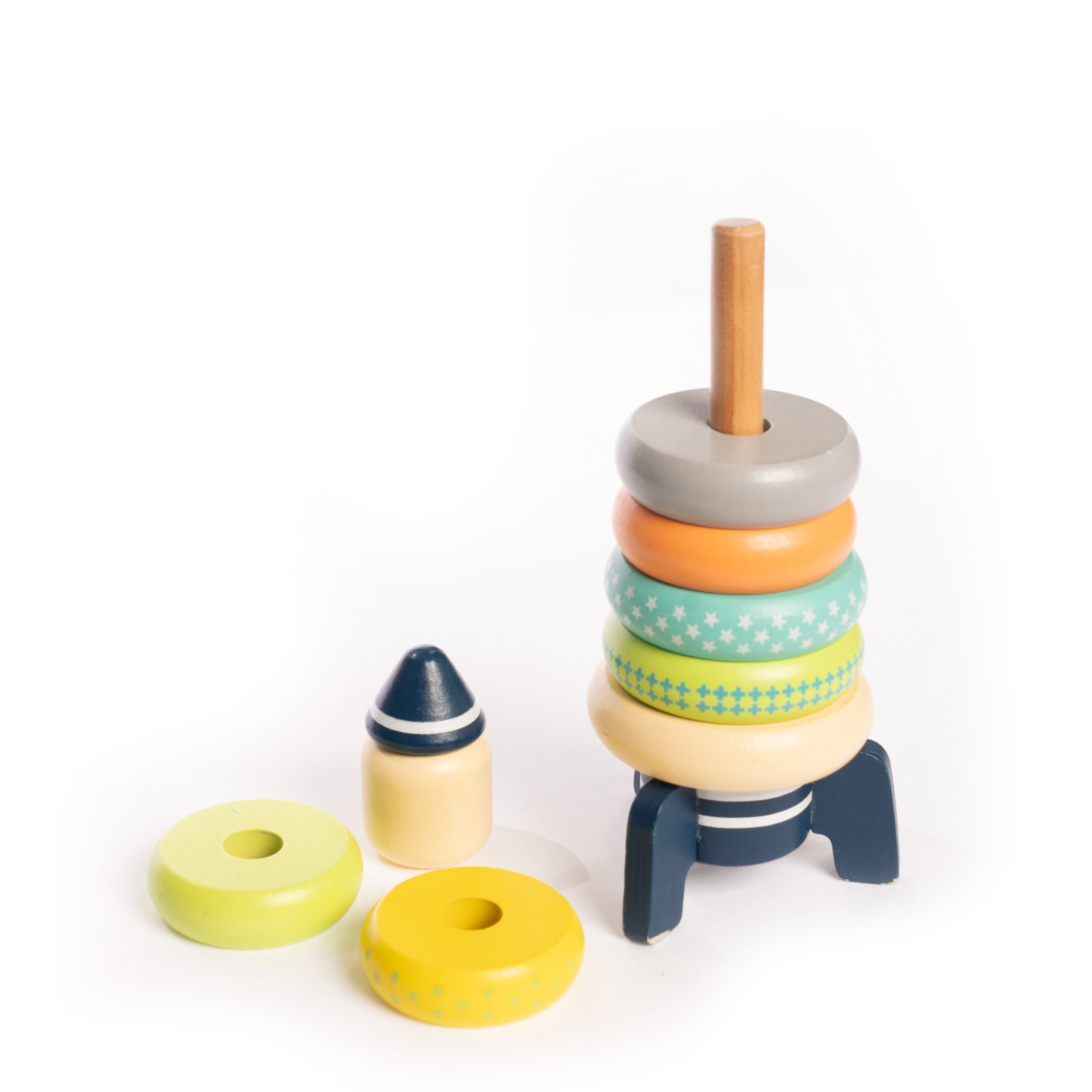 Stack the magnetic wooden pieces atop this sturdy base to create a rocket ship! This stacker encourages motor development, colour recognition, and cause and effect learning. Blast off into stacking playtime!