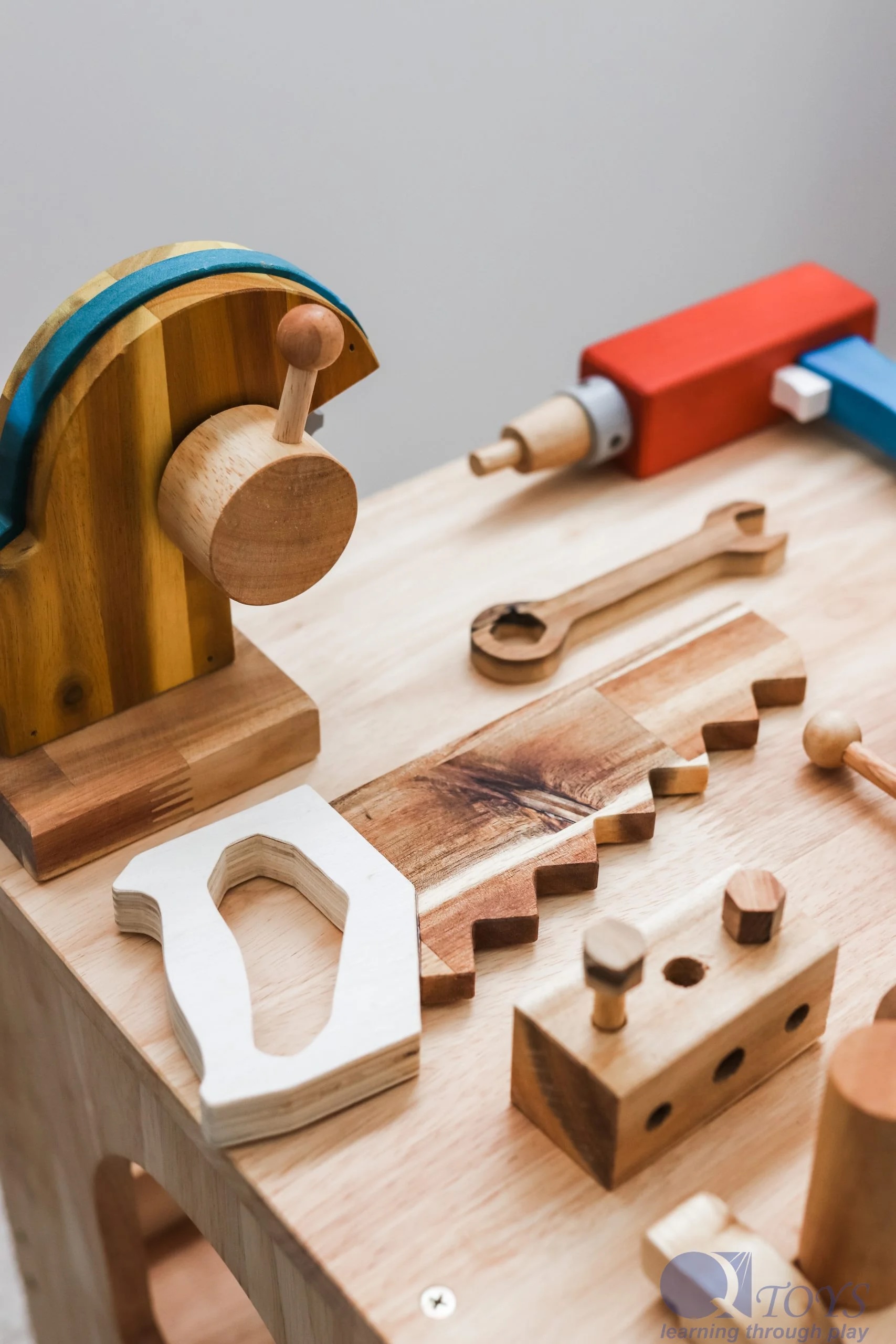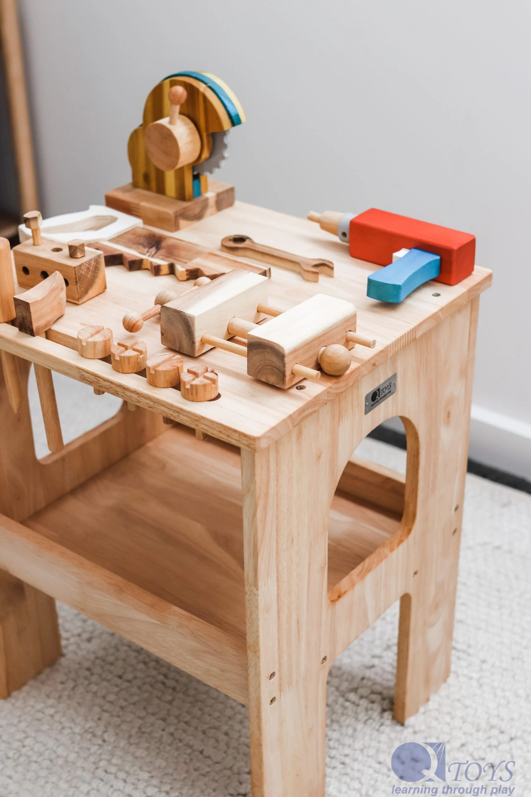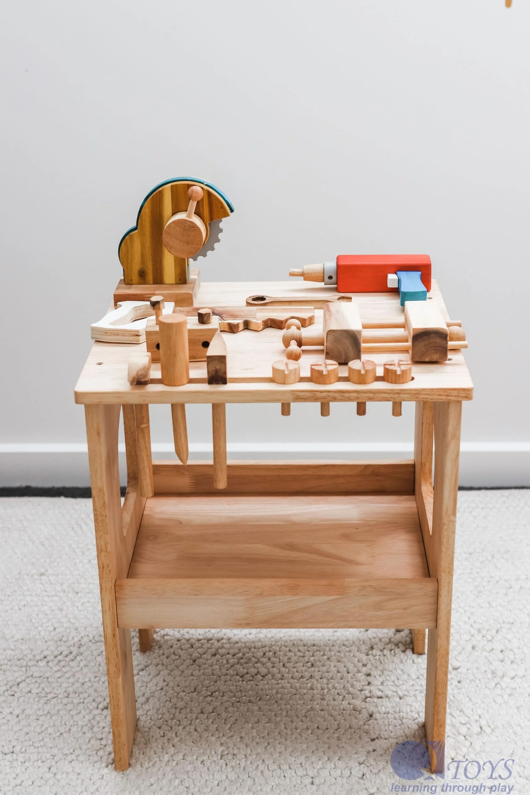 This wooden workbench set can be a great addition to a toddler’s toy collection. It provides many opportunities for imaginative play and learning. The set features a solid wooden top, a wooden vice, a storage tray and table saws. It is a good-sized work bench which provides opportunities for children to work together and share ideas.